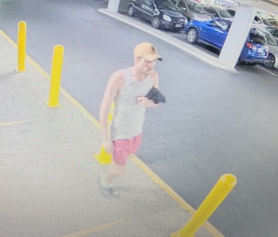 The offender is described as a Caucasian male with a goatee beard, wearing bright red shorts, dark sandals with white ankle socks, a grey singlet, orange hat and carrying a black item…